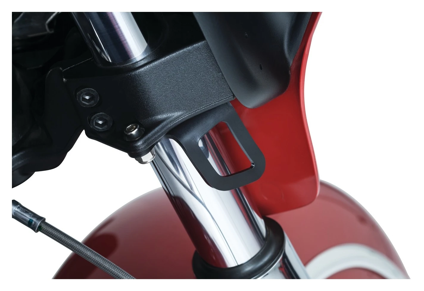 Trailering your Indian just got a lot easier. Laser cut from high strength steel, these custom brackets mount to the lower triple tree which provides a secure location to attach straps for easy and safe transport.