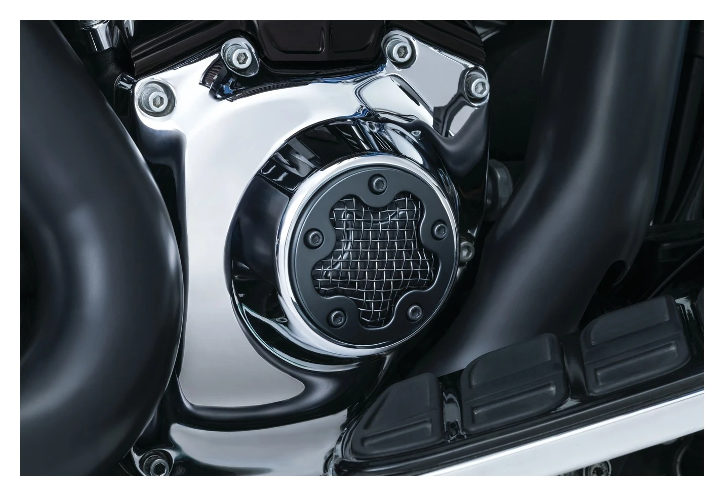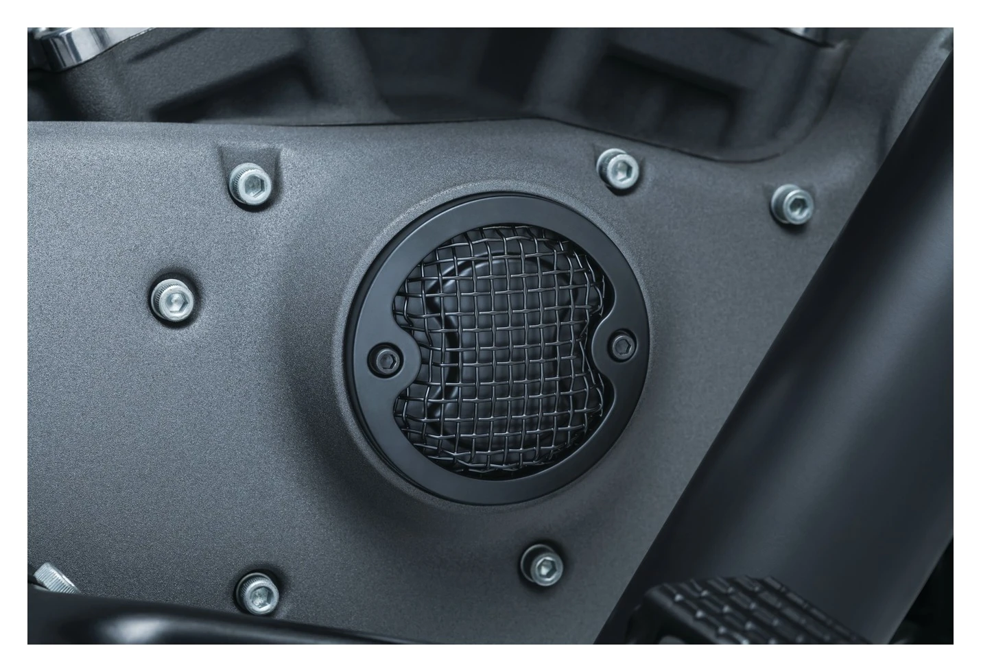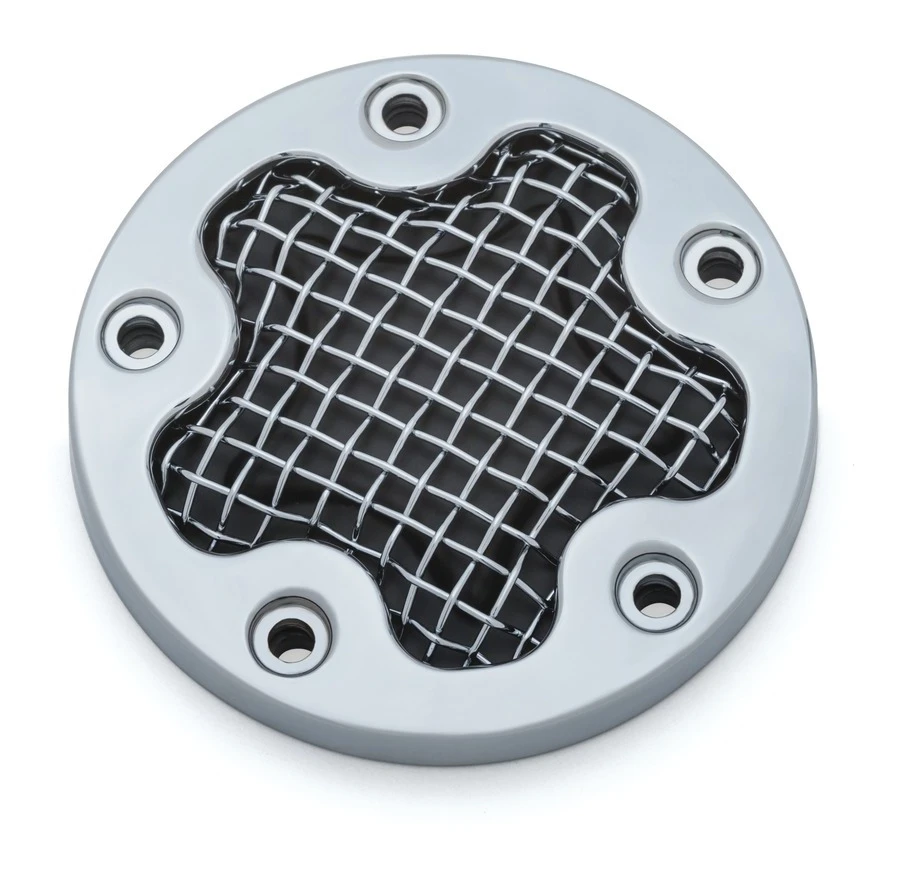 Bolt-on replacement for stock timing covers with a unique three-piece design that provides a rugged and dynamic textured appearance. Formed steel mesh insert is secured by the aluminum baseplate and outer frame upon installation with included hardware.