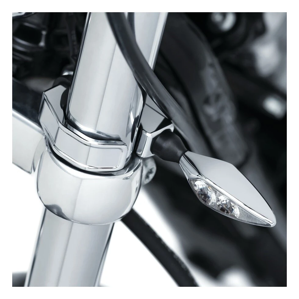 Kuryakyn Fork Mounts ease the process of installing fork-mounted turn signals. The unique clamping system adjusts to fit 39mm up to 49mm fork tubes and accepts any aftermarket turn signals using an M8-1.25 threaded stud.Â